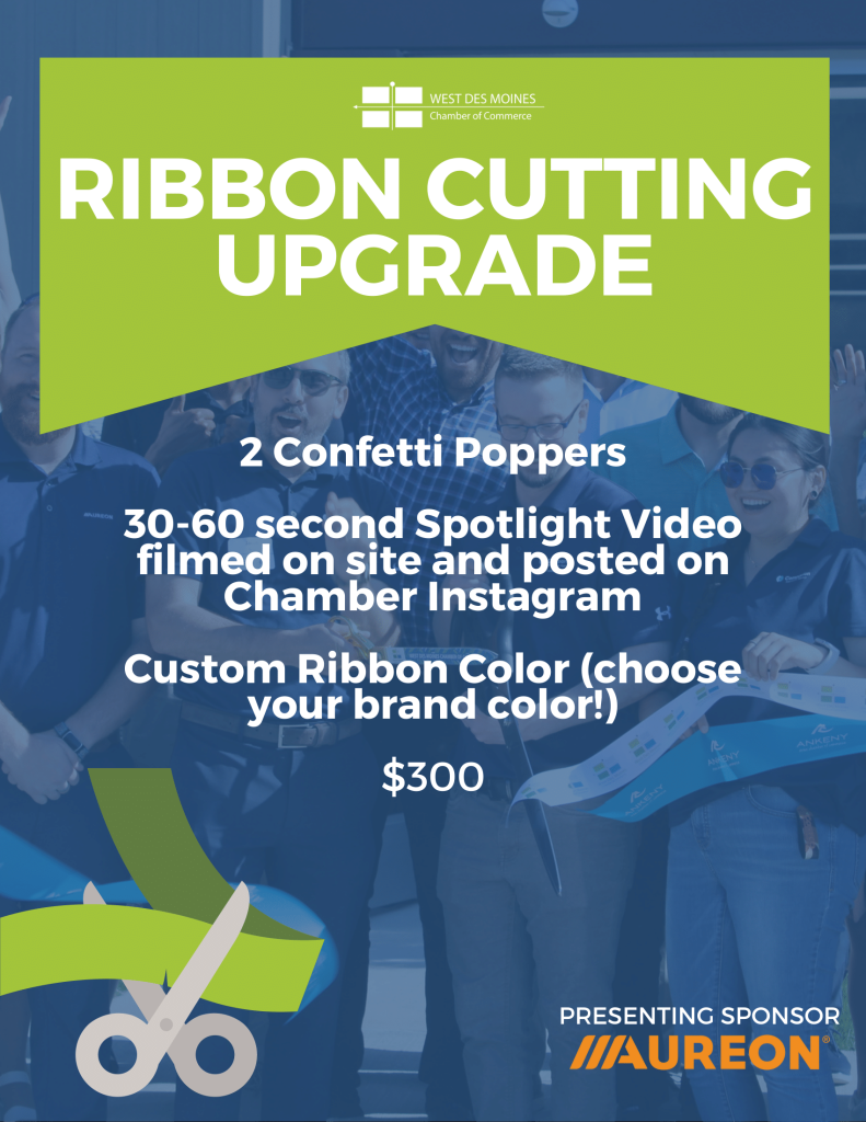 Ribbon Cuttings are a complimentary West Des Moines Chamber of Commerce member benefit. They are only planned for a business’ expansion, relocation, grand opening, major anniversary or ground breaking. Members must be in good standing and dues paid in full before the ribbon cutting occurs. The following guidelines will assist you in planning a successful ribbon cutting. Complete the form below to reserve your ribbon cutting today.